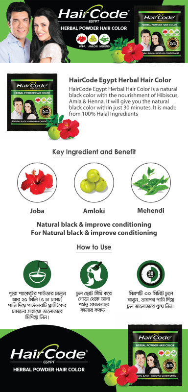 • Hair Code Egypt Herbal Hair Color is a natural black color with the nourishment of Hibiscus, Amla & Henna. It will give you the natural black color within just 30 minutes. It is made from 100% Halal Ingredients.