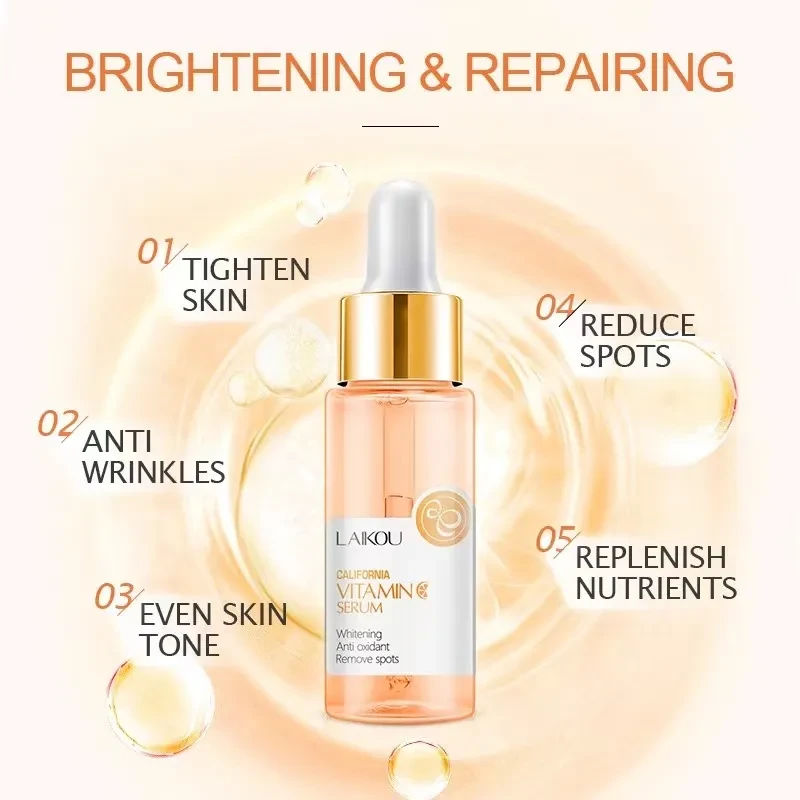 Laikou California Vitamin C Serum is a powerful antioxidant serum designed to brighten and smooth the skin for a more radiant and youthful complexion. Its advanced formula provides strong antioxidant protection to prevent melanin formation and protect the skin from environmental damage. This serum also helps to remove acne spots and blemishes, promoting a clearer complexion. To use, simply clean your face, take 3-5 drops of serum in the palm of your hand, and apply it to your face with your fingertips. Massage the serum into your neck to ensure absorption. For best results, apply the serum twice a day, in the morning and at night.