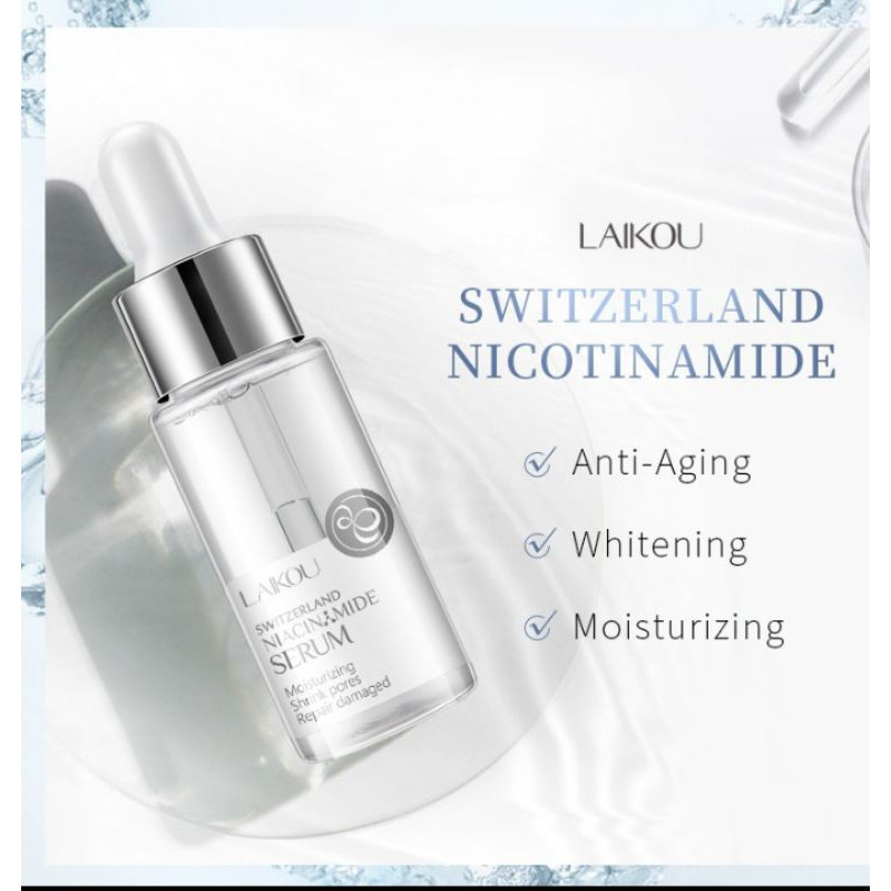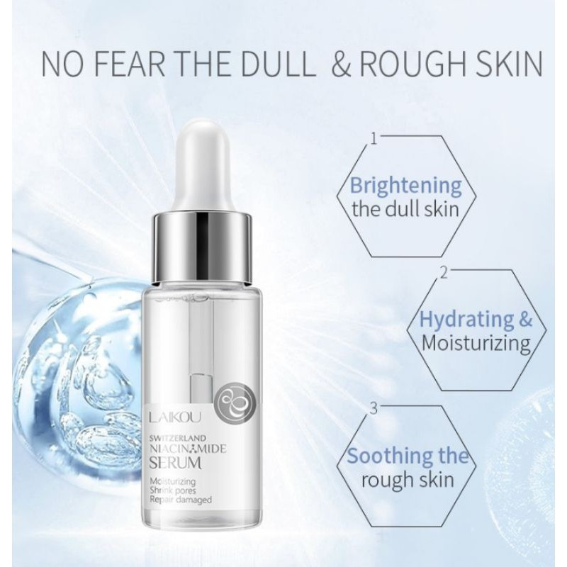 LAIKOU Switzerland Niacinamide Serum is a multifunctional skincare product designed to address various skin concerns and promote overall skin health. Enriched with niacinamide (also known as nicotinamide), hyaluronic acid, and ceramide, this serum delivers essential nutrients to the skin, helping to hydrate, brighten, and rejuvenate. It effectively relieves dullness, smoothens fine lines, and improves skin elasticity, giving you a more youthful and radiant complexion. With regular use, this serum helps create watery, lustrous, and elastic skin, combating the effects of aging, environmental stressors, and lifestyle factors. Incorporate LAIKOU Switzerland Niacinamide Serum into your skincare routine for hydrated, glowing, and healthy-looking skin.