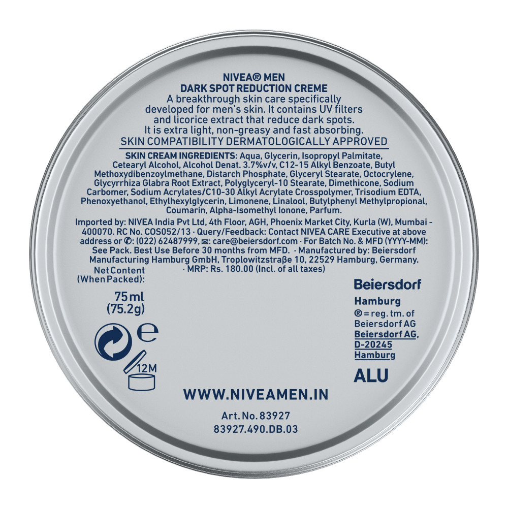 NIVEA MEN Dark Spot Reduction Cream. A breakthrough skin care specifically developed for men’s skin. It contains UV filters and licorice extract that reduce dark spots. It is extra light, non-greasy and fast absorbing. HOW IT WORKS It reduces dark spots. It is extra light, non-greasy and fast absorbing. Specifically designed for men's skin. Contains UV and licorice extract that reduce dark spot. Extra-light, non-greasy and fast absorbing. Skin compatibility dermatologically approved.