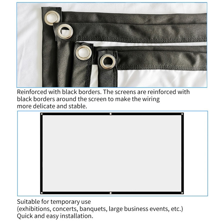Description: Welcome to our store! Our Simple Folding Thin Polyester Projector Film Curtain is designed with convenience and versatility in mind. Crafted from durable polyester material, this movie screen adopts the principle of old-fashioned movie screens, allowing it to be folded easily for carrying and washing. Its versatility makes it suitable for various settings such as home use, outdoor screenings, bars, restaurants, outdoor camping, tourism, and more.
