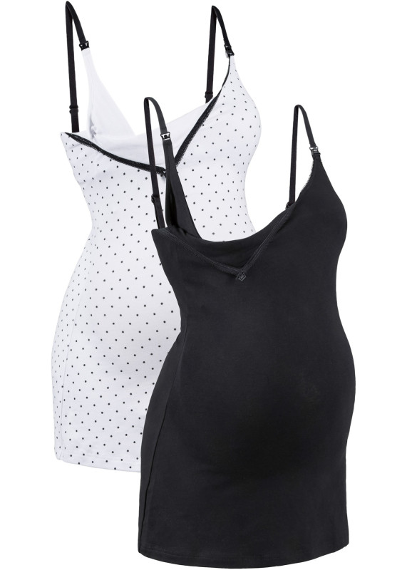 This pack of tops from Nice Size is ideal for pregnancy and breastfeeding. The model is made of soft, supple material that offers a high level of comfort and plenty of space for the growing belly. Thanks to the practical click fastener on the neckline, opening for breastfeeding is particularly easy. The straps of the nursing top are adjustable in length. Please order in your usual size.